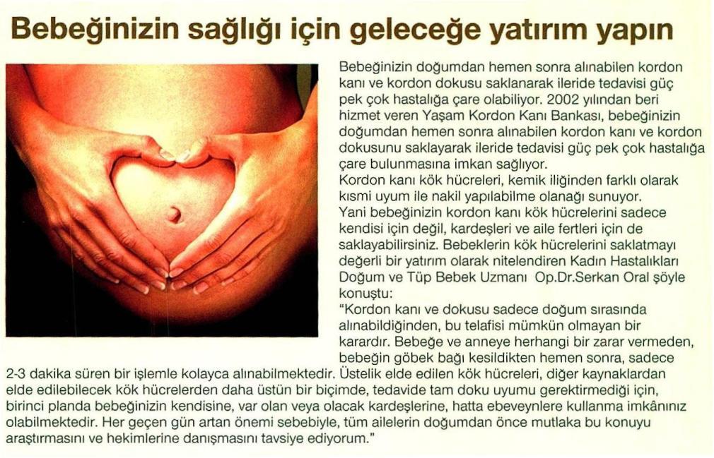 Bebeğinizin doğumdan hemen sonra alınabilen kordon kanı ve kordon dokusu saklanarak ileride tedavisi güç pek çok hastalığa çare olabiliyor.