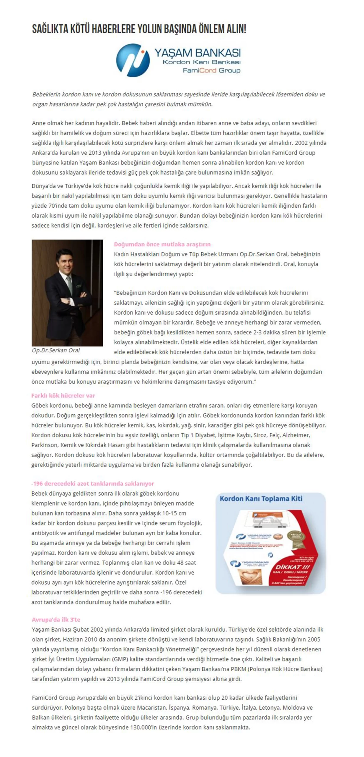 Kadın Hastalıkları Doğum ve Tüp Bebek Uzmanı Doç. Dr. Serkan Oral, bebeğinizin kök hücrelerini saklatmayı değerli bir yatırım olarak nitelendirdi.