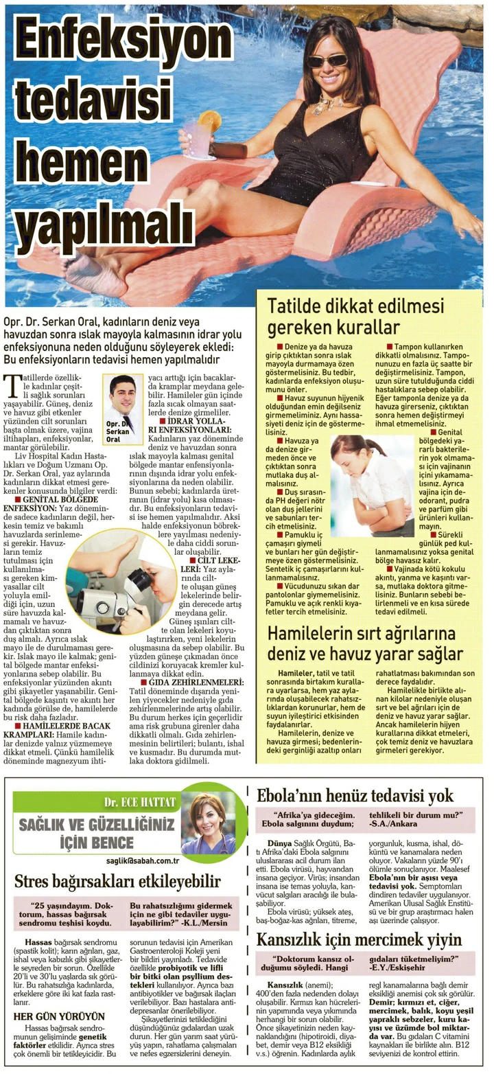 Kadın Hastalıkları Doğum ve Tüp Bebek Uzmanı Doç. Dr. Serkan Oral, kadınların deniz ve havuzdan sonra ıslak mayoyla kalmasının idrar yolu enfeksiyonuna neden olduğunu söyleyerek ekledi: “Bu enfeksiyonların tedavisi hemen yapılmalıdır.”