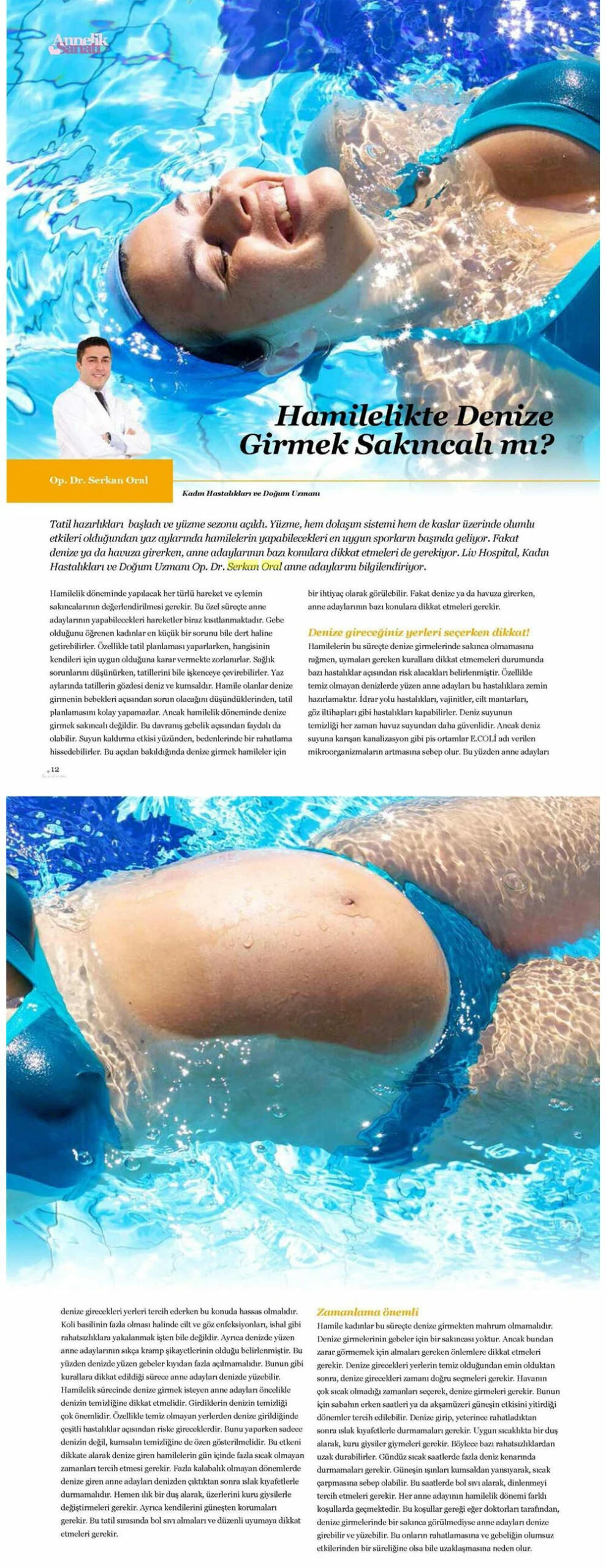 Yüzmenin hem dolaşım sistemi hem de kaslar üzerinde olumlu etkileri olduğundan yaz aylarında hamilelerin yapabilecekleri en yaygın sporların başında geliyor. Fakat deniz veya havuza girerken annne adaylarının bazı konulara dikkat etmeleri gerekiyor. Kadın Hastalıkları Doğum ve Tüp Bebek Uzmanı Doç. Dr. Serkan Oral anne adaylarını bilgilendiriyor.