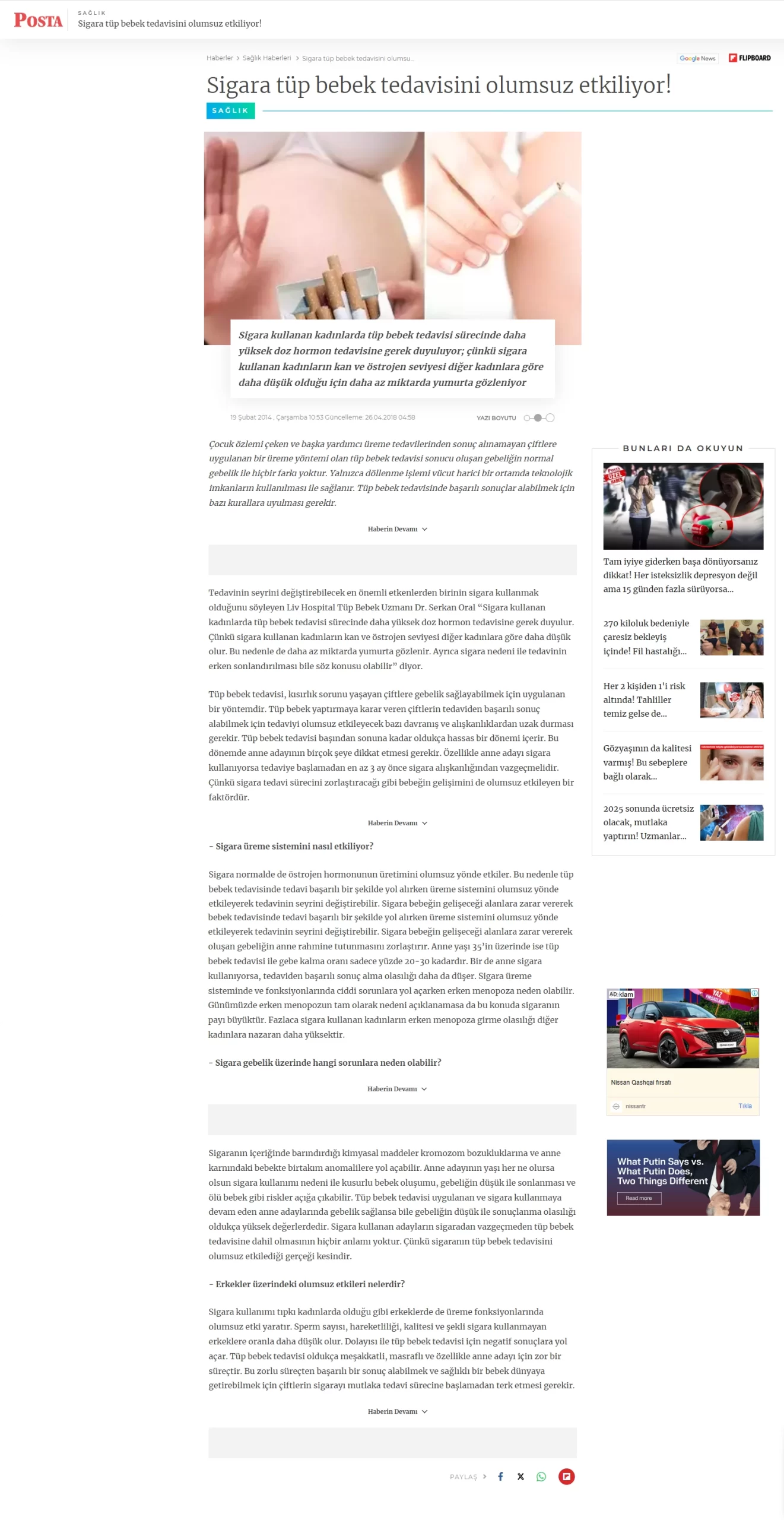 Sigara kullanan kadınlarda tüp bebek tedavisi sürecinde daha yüksek doz hormon tedavisine gerek duyuluyor; çünkü sigara sigara kullana kadınlarda kan ve östrojen seviyesi diğer kadınlara göre daha düşük olduğu için daha az miktarda yumurta gözleniyor. Kadın Hastalıkları Doğum ve Tüp Bebek Uzmanı Doç. Dr. Serkan Oral, sigara içmenin tüp bebek tevavisindeki olumsuz etkilerini anlattı.